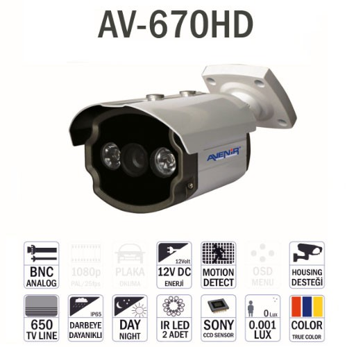 Stokta Yok ! Lütfen Varyant Seçiniz (Renk/Beden) MODEL | AV-670HD | Görüntü Sensörü | 1/3" SONY Processor Aptina Megapixel IR-CUT Filter | Kamera Tipi | DıŞ ve iç mekan ledli kamera | Piksel Değeri | 752 (Yatay) x 582 (Dikey) | IR LED | 2 Adet Atom Array Ledli | OSD Menü | Yok | Day & Night Modu | Day night modu var | Tarama Sistemi | 2 : 1 Interlace | Çözünürlük | 700 TVL (Renkli) | IŞık Hassasiyeti | 0.0Lux (Renkli), 0.0Lux (Siyah/Beyaz) | Lens aralığı | 4/6 lens opsiyonel | Poz Süresi | Otomatik | S/N Oranı | 50dB (AGC Kapalı) | Shutter | Yok | Gizli Maskeleme | Yok | Sinyal Sistemi | PAL/NTSC | Sugeçirmezlik | Su geçirmez | Kazanç Kontrolü (AGC) | Otomatik | Arka IŞık (BLC) | Otomatik | Mirror | Yok | Beyaz Dengesi | Otomatik | WDR | Yok | DNR | Yok | DSS (Sens up) | Yok | Titremesiz (FL) | Otomatik | Video ÇıkıŞı | 1.0Vp-p/75 (Video 0.7 Vp-p Sync 0.3 Vp-p) | Güç Tüketimi | 12V DC (Maks. 1A) | ÇalıŞma Isısı / Nem | -10 °C ~ +50 °C / Nem: 30 ~ %80 RH |