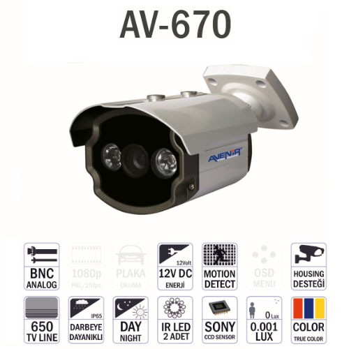 Stokta Yok ! Lütfen Varyant Seçiniz (Renk/Beden) MODEL | AV-670 | Resim Sensör | 1/3" SONY Processor Aptina Megapixel IR-CUT Filter | Tarama Sistemi | 5.2 mm(H) x 4.8 mm(V) | Resim Elementleri | 976(H) X 500(V) / 1020(H) X 596(V) | TV Sistemi | PAL/NTSC | Yatay Çözünürlük | 800 TVL (Görüntü Kalitesi) | Minimum Aydınlatma | IRON OLux | S/N Oranı | 50 dB (Age Kapalı) | Işık Hassasiyeti | O.OLux (Renkli), O.OLux (Siyah/Beyaz) | Otomotik İris Kontrolü | Auto | Gamma Özelliği | 0.45 | Otomatik Kazanç Kontrolü | Auto | Otomatik Beyaz Kontrolü | Auto | Geri Işık Kontrolü | Auto | Otomatik Ayar Uyumu | Internal Synechronization | Lens | 4/6 mm | Video Çıkışı | l.OVp-p/75 (Video 0.7 Vp-p Sync 0.3 Vp-p) | İnfrared Ayrınlatma | 40-50 M | Led Sayısı | 2 Array Led | Güç Kaynağı | DC 12V | Güç Tüketimi | 500 m A (IRON, MAX 1 A) | Çalışma Sıcaklıkları | -10 °C - +50 °C / Nem: 30 - %80 RH |