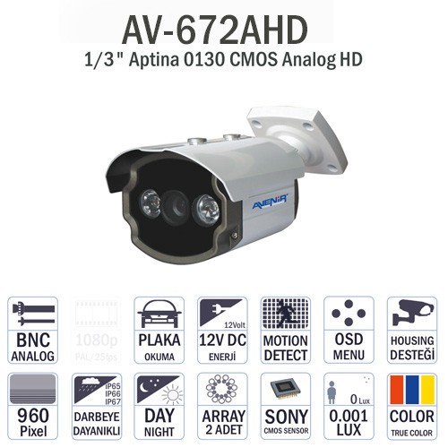 Stokta Yok ! Lütfen Varyant Seçiniz (Renk/Beden) | | | | MODEL | AV-671AHD | | Resim Sensor | 1/3" Aptina 0130 CMOS,Analog HD | | Çözünürlük | HD 720P | | MODEL | AV-672AHD | | Resim Sensor | 1/3" Aptina 0130 CMOS,Analog HD | | Çözünürlük | HD 960P | | ÖZELLİKLER | | Kamera | Vandalproof IR Bullet Camera | | Led Sayısı | 2 pcs Array Led | | Gece Görüş Mesafesi | Range 30M | | Lens | 3.6mm | | Ayak | 3-Axis Eyeball | | Renk | Grey /White/Black | | Dnr | 2DNR | | IR-CUT | Var | | Wdr | DWDR | | Sistem | HD-AHD | | Menü | OSD Menü | | Koruma Sınıfı | IP66 | | Ağırlık | 0.7Kg | | Çalışma Sıcaklığı | -20°C / 50°C | | Güç Kaynağı | DC 12v |
