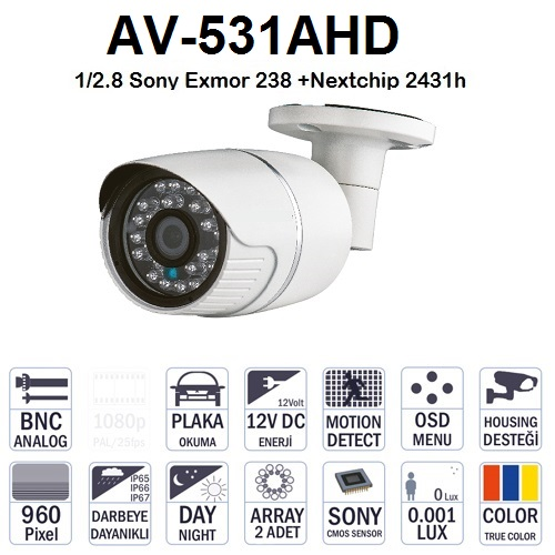 960P, Bullet Dış Mekan MP Analog High Definition Kamera AHD 1/2.8 Sony Exmor 238 +Nextchip 2431h, Analogy HD 3DNR,Anti Foggy, DWDR, HD-AHD,OSD cable Vandalproof IR Bullet Camera 42 leds IR Range 40-50M Board lens 3.6mm fix Lens Water resistance: IP66 Weight:0.5Kg White