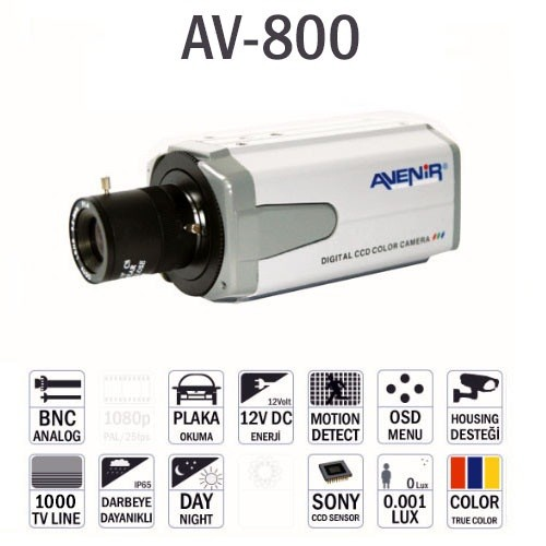 Stokta Yok ! Lütfen Varyant Seçiniz (Renk/Beden) MODEL | AV-800 | Resim Sensör | 1 / 3" Megapixel Ir Cut Filter Cmos "Menülü" | Çözünürlük | 1000 TVL (Görüntü Kalitesi) | Sinyal Sistemi | PAL: 1024(H) x 786(V) NTSC: 811 (H) x508 (V) | Tarama Sistemi | 2:1 Interlace | Tarama Frekansı (H) | 15.625 KHz 15.734 KHz | Tarama Frekansı (V) | 50(V) 60 (V) | Sync. Sistemi | Internal / Line Lock | Işık Kesme Özelliği | Var | Gerçek Piksel | 795(H) 596 (V)l 8II (H) 508 (V) | Gürüntü Oranı | 50 dB ' den fazla | Video Çıkışı | CVBS: I.O Vp-p (75 Ohm) | Lens | C/CS Mount | Menü Özelliği | Var | Min. Çalışma Işığı | 0.002 Lux/F 1.2 (Sens-Up * 128 X) | Arka Işık Ayarı (BLC) | On / Off | Kazanç Ayarı (AGC) | On / Off | Beyaz Ayarı (AWB) | On / Off | Elektronik Shutter Hızı | 1/50 - 1/100,000 sec 1 /60 - 1 /100,000 sec | Çalışma Voltajı | DC 12 V / AC 24 V | Maksimum Akım | 120 mA |